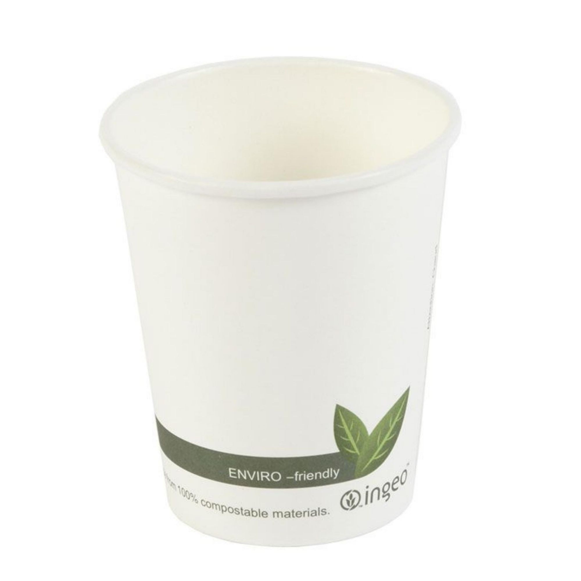 Choose eco-friendly Ingeo? Disposable Cups, perfect for food and takeaways. Fit for hot or cold drinks, they hold 8oz/237ml. Elevate sustainability by restocking with these cups. They feature a sleek off-white look with a green band, displaying eco attributes. Details are in dark green around the base, along with attention notices and SUPD logo. Made from paper with a corn starch PLA lining, these cups ensure a safe and comfy drink. They meet Single Use Plastic Directive standards. Conveniently available in packs of 1,000, secure your order online or via our team for swift delivery. Explore our extensive pharmacy and medical products.